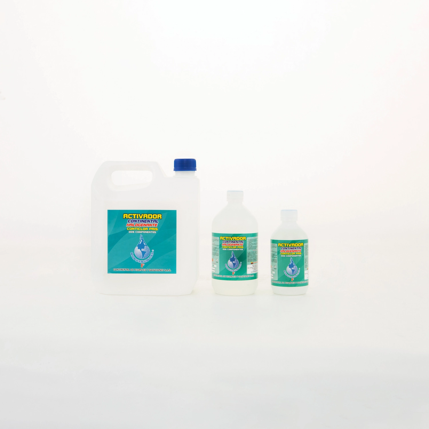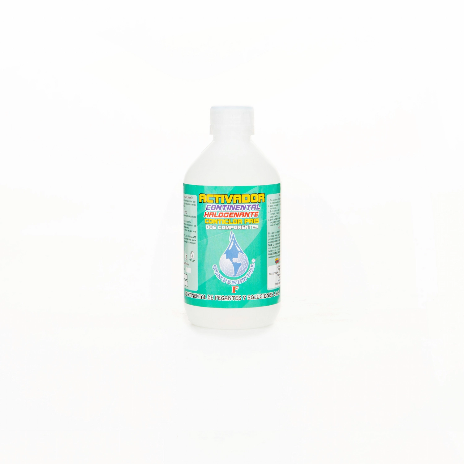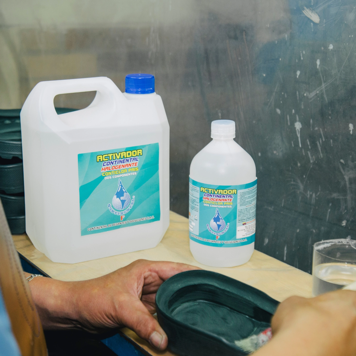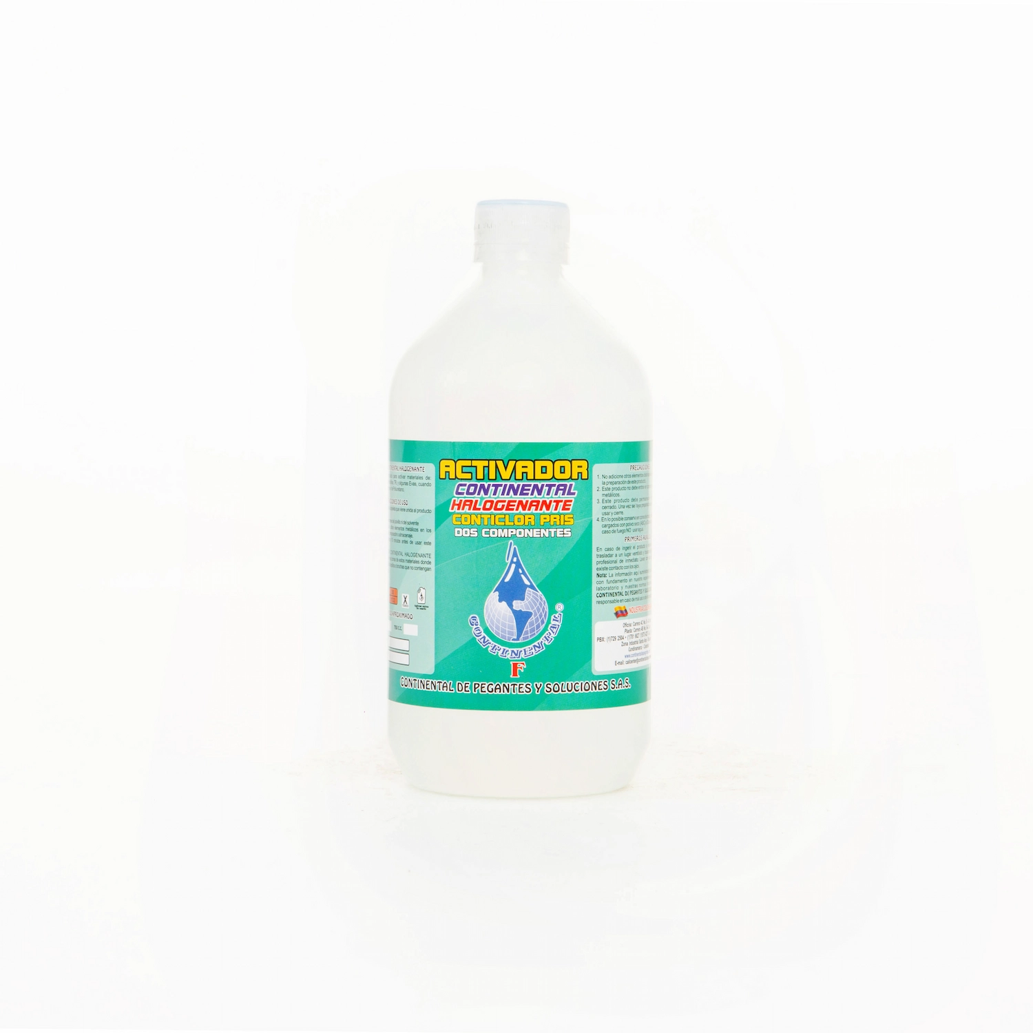 Halogenante activador bi-componente, que consiste en una mezcla de solventes orgánicos y un agente fijador (polvo) por diluir. Especialmente formulado para la preparación de suelas y accesorios.